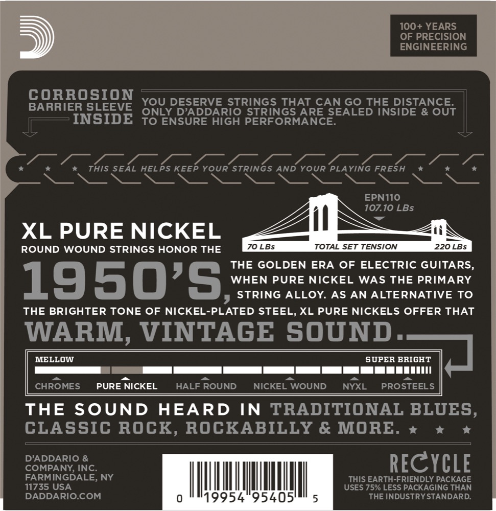 Dessa strängar från D’Addario tar dig tillbaks till 50-talet då nickel var den mest använda legeringen på strängar. Efterhand som behovet ökade för klarare toner och högre magnetism, blev nickelpläterad stål en industristandard på 60-talet. D’Addarios XL Pure Nickel är ett alternativ för dig som vill ha en varm vintage-karaktär eller brittpopinspirerat gitarrljud! Set finns i dom vanligaste tjocklekarna.