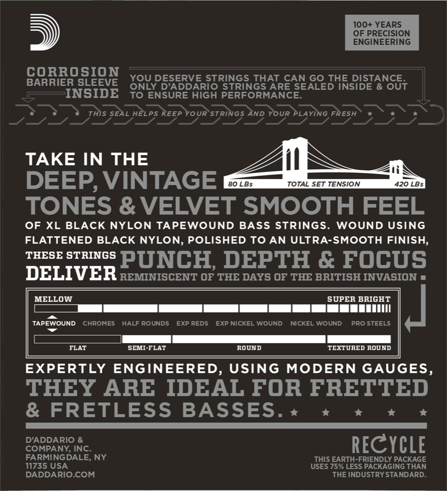 ETB92 Black Nylon Tapewound har en kombination av värme, djup ton med en ultramjuk känsla. Strängen är slipad och polerad, och ger en djup fokuserad Vintage-ton eller lite tonen av en ståbas. Passar ypperligt till bandlösa basar.