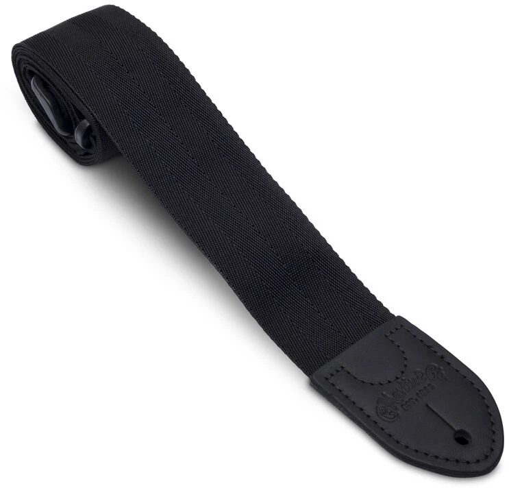Komfortabelt, vävt axelband för gitarr och bas i bomull med läderändar där den främre läderänden  har plektrumhållare och inpräntad C.F. Martin-logo.