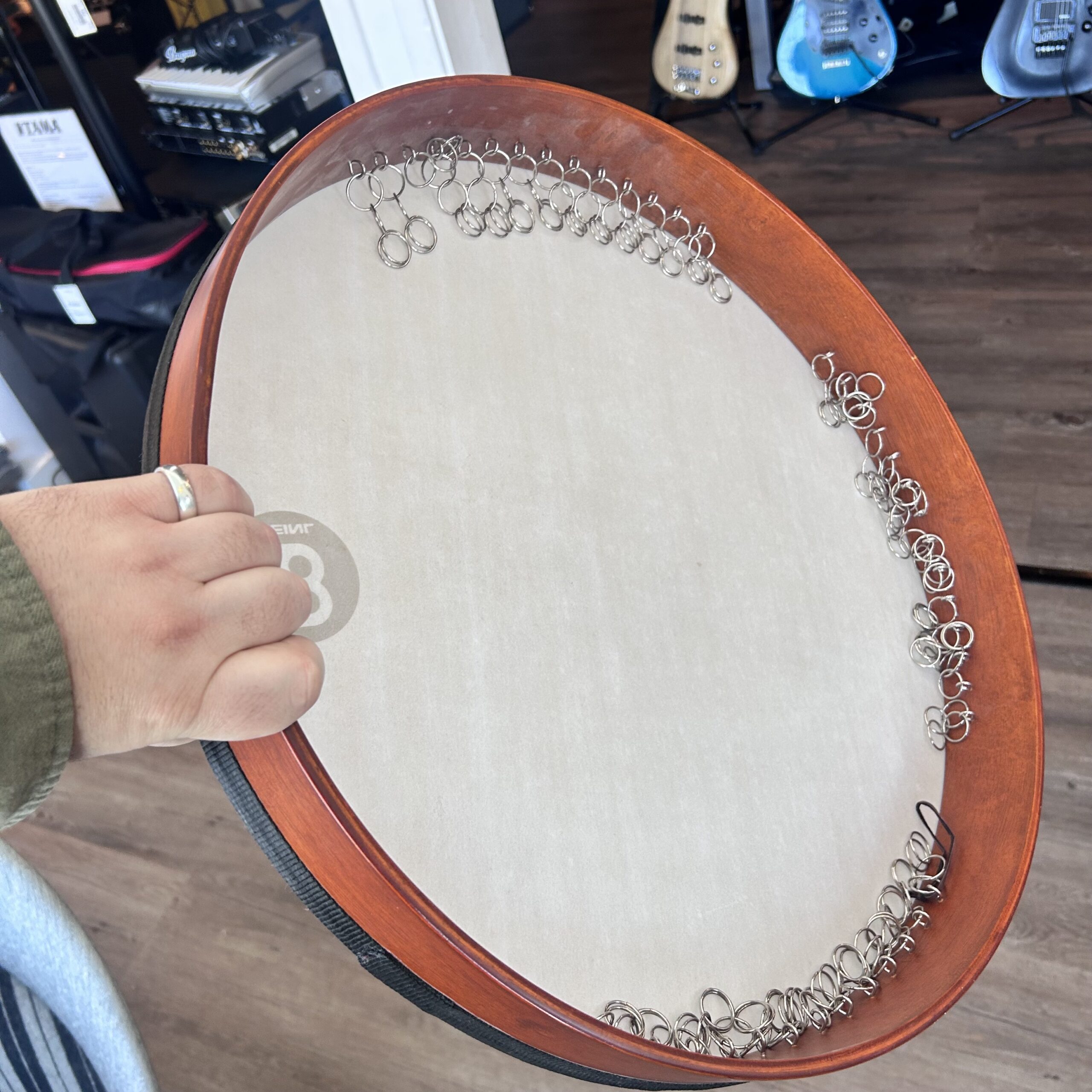 Vi säljer en begagnad traditionell persisk handtrumma med ”ring-sejare”/metalringar på undersidan av trumman av märket meinl för kunds räkning.